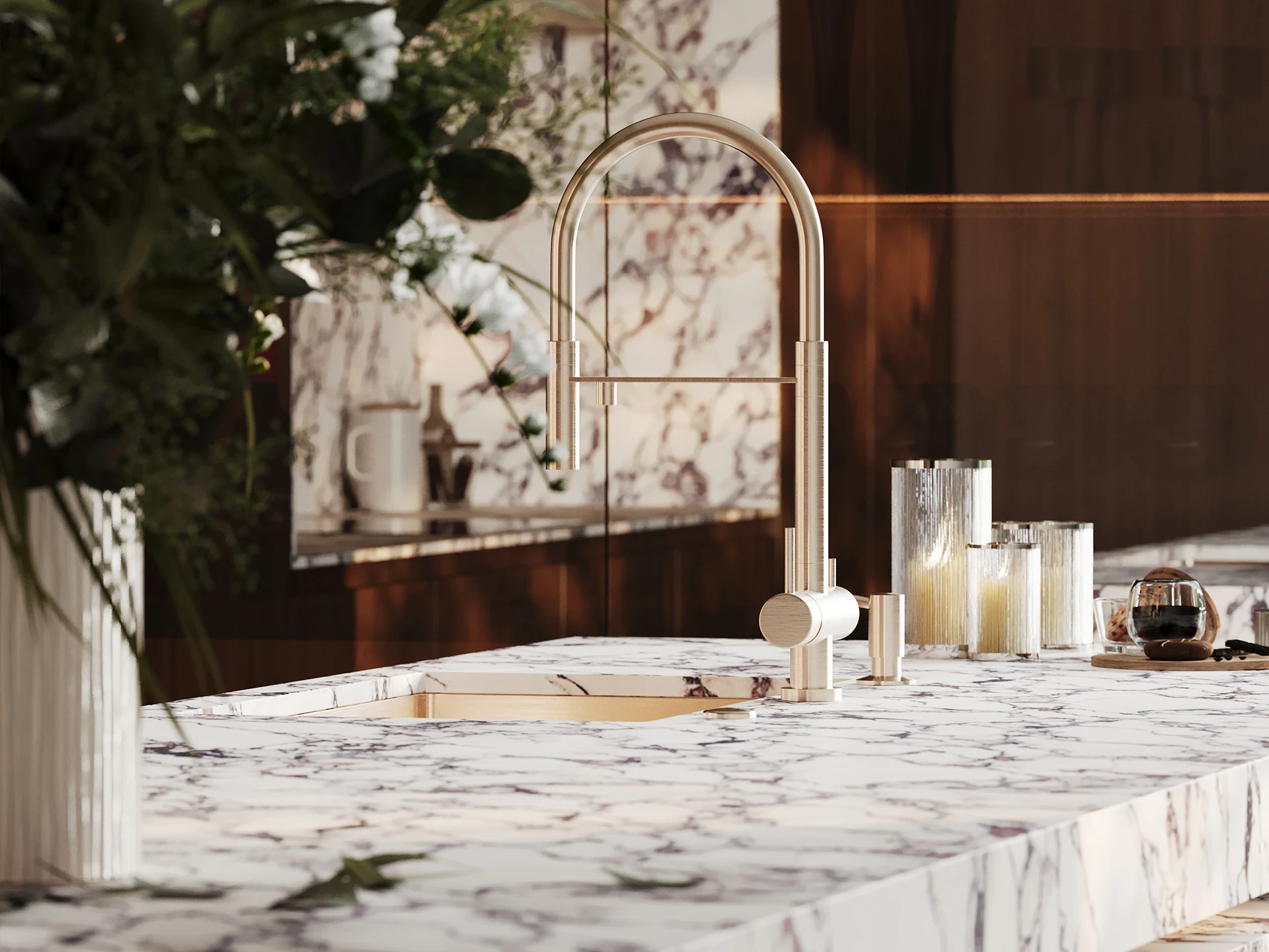 With dramatic marble veining and golden accents, Aurora Luxe transforms the kitchen into a statement of glamour and artistry.