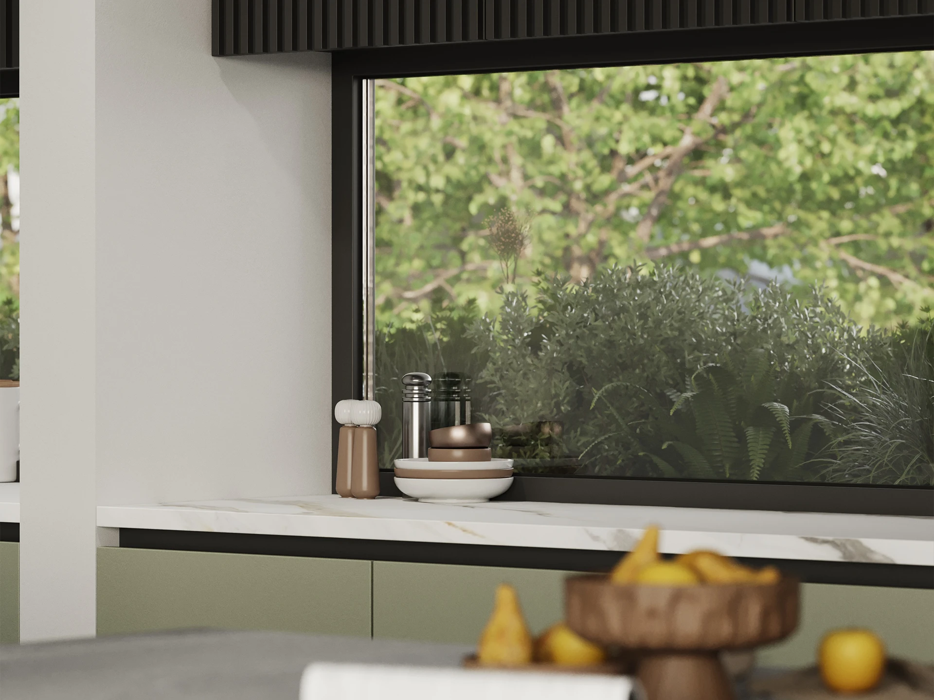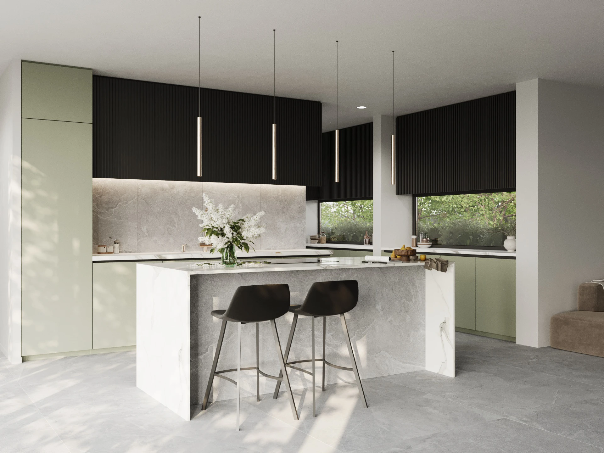 Sage Noir blends muted green cabinetry with dark overheads and stone textures, striking a balance between modern freshness and sophisticated depth. Perfect for a contemporary edge with character.
