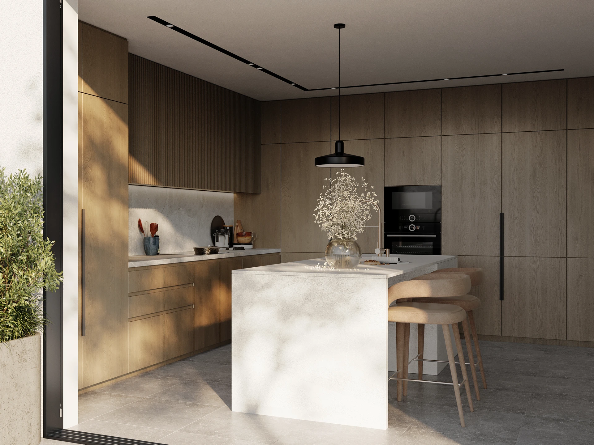 A calm blend of soft oak cabinetry and smooth stone surfaces, Stonehaven creates a kitchen that feels welcoming, grounded, and serene.