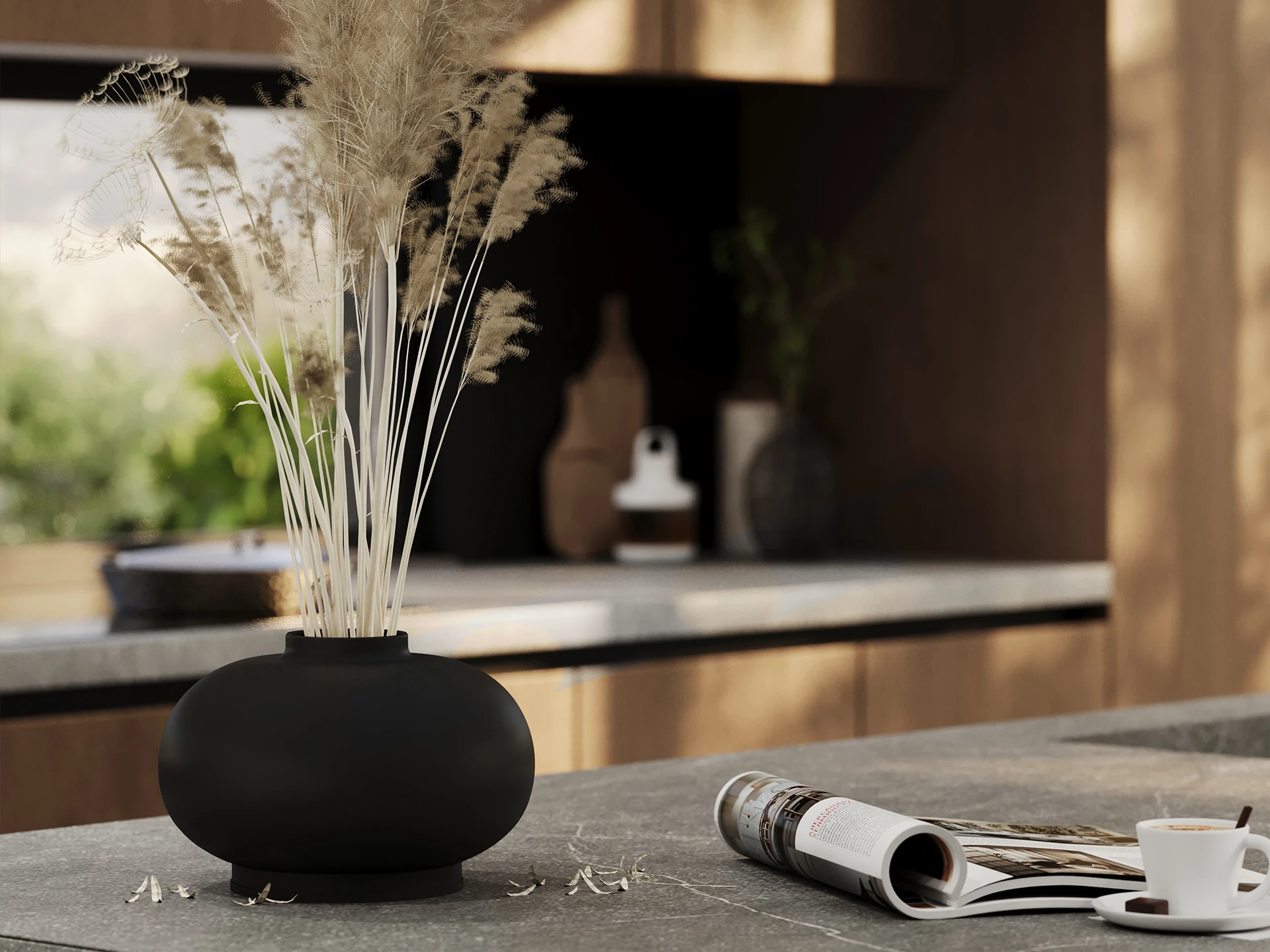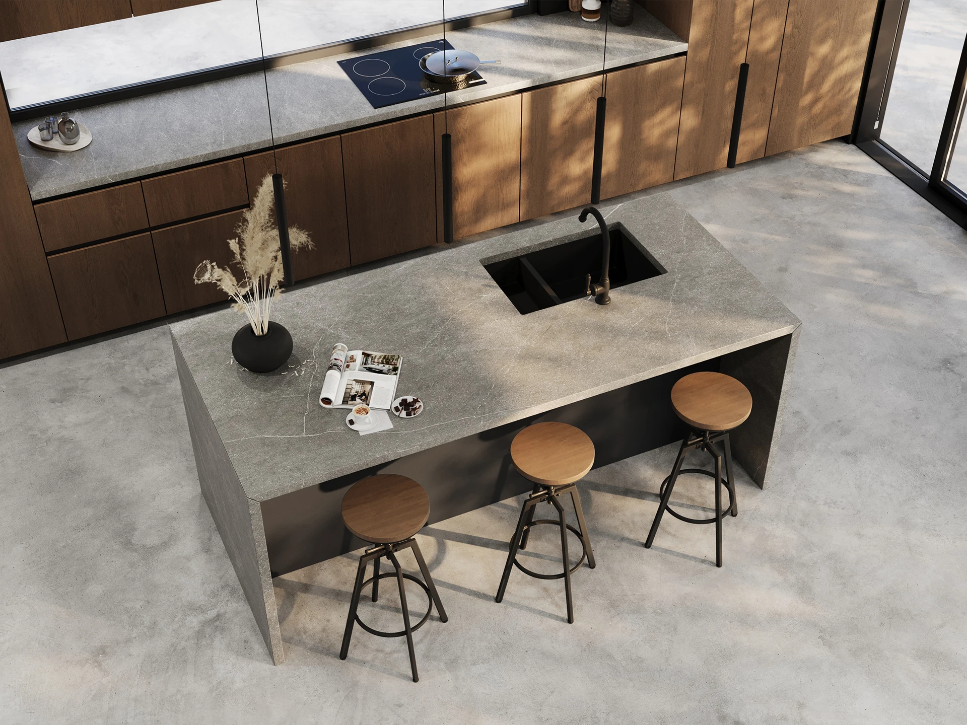 Dark timber meets sleek grey stone in a bold yet organic design. Urban Grove is ideal for open living spaces, where contemporary style merges seamlessly with a grounded, natural vibe.